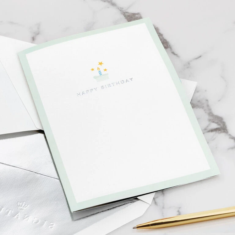 Pop-up birthday greeting card features a candle-topped slice of cake and gold stars paired with a “happy birthday” message in silver foil and a light blue border. Simply open the card to reveal the 3D pop-up surprise insideāno assembly required: an intricate, laser-cut slice of birthday cake pops out. A die-cut candle, striped “hooray” party banner, colorful balloons, silver stars and a fork with glitter and foil accents add festive touches to the inside of the card. When open, this pop-up card lays flat for display; 3D pop-up inside measures approx. 3.75″ H.
